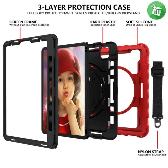 • Built-in Kickstand for the convenience of watching videos and chatting You can carry tablet with should belt and even hang it on your car seat