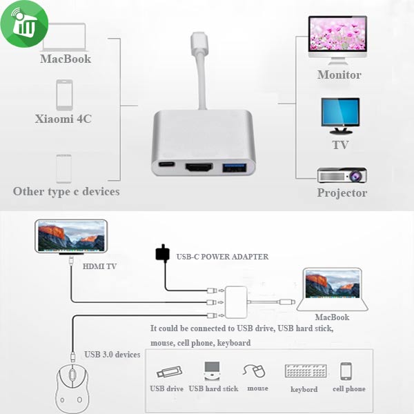 Combining the port of HDMI, USB3.0, type C/F into one, the Type-C to HDMI+USB3.0+Type-C/F adapter allows you to connect your type C supported computers to the devices with HDMI port and other devices with USB3.0 port. The type C/F offers you easier charging way.