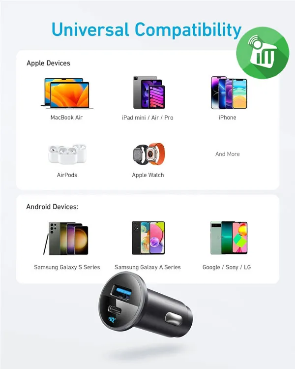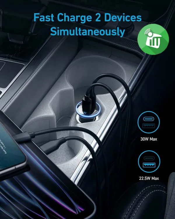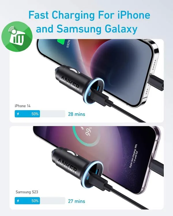 Anker A2735 Charger 52.5W Works seamlessly with all types of cars with a cigarette lighter port and supports charging a wide range of electronic devices