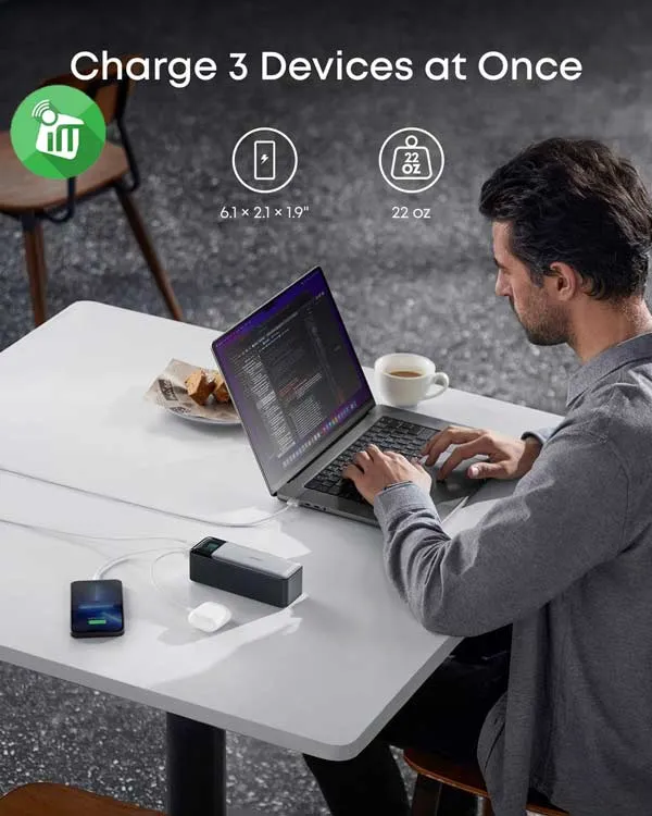 Power up your devices in record time with the 140W output of the Anker 737 Power Bank. Capable of charging your laptop, smartphone, tablet, or other devices simultaneously, this power bank offers multi-device charging through its three ports: USB-C and USB-A. Whether you’re powering up a MacBook, iPhone, or Samsung Galaxy, this power bank ensures quick and efficient charging for all your devices.