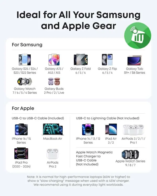 Compatible with a wide range of devices, from iPhones and Samsung phones, to tablets (iPad Pro and Air), to earbuds and more. Advanced