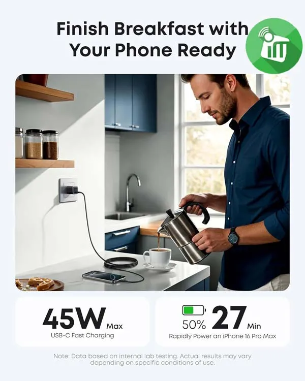 Gallium Nitride (GaN) technology ensures exceptional power efficiency and reduced heat, keeping your device safe and extending its battery life.