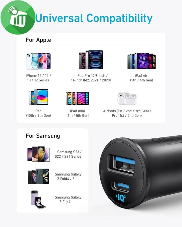 Anker A2741 Car Charger Power two phones simultaneously via the USB-C and USB-A ports, providing a practical solution for owners of multiple devices.