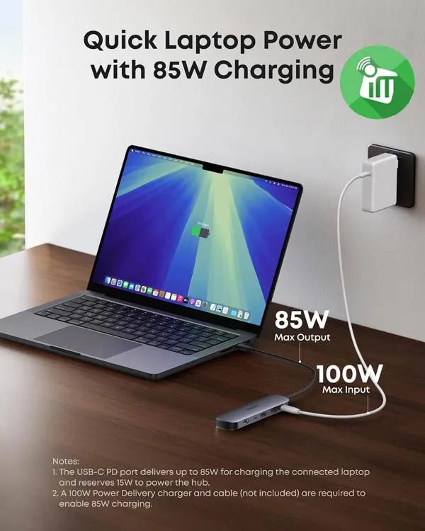 Achieve optimal charging with 85W pass-through power to your laptop, supported by a total input of 100W, with the hub reserving 15W for operational efficiency. (Note: Wall charger not included.)
