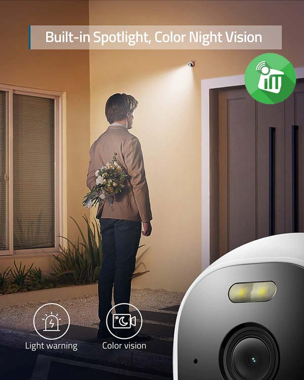 The powerful built-in spotlight on the outdoor security camera illuminates the surrounding area when relevant motion is detected. It also ensures that you can keep an eye on any spot in full-colour, even in low light.