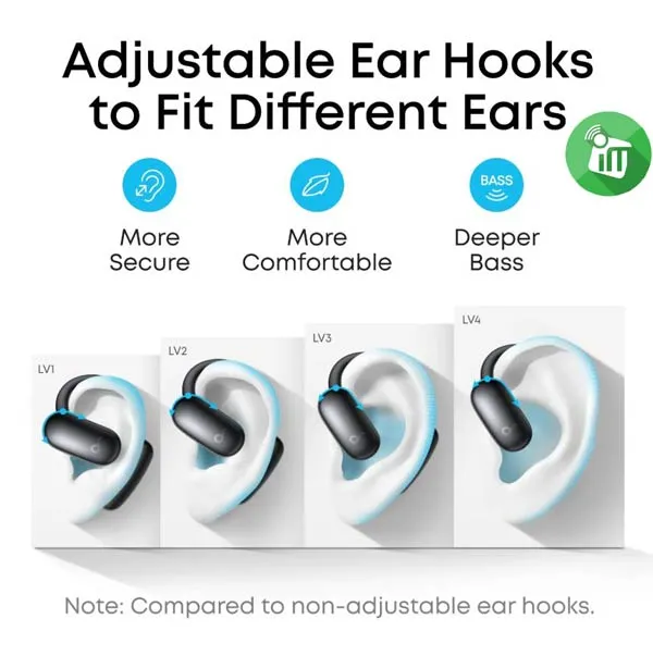 Double-curved surface and soundcore’s innovative 4-level adjustable ear hooks ensure a pressure-free fit tailored to over 99% of ear shapes and sizes.