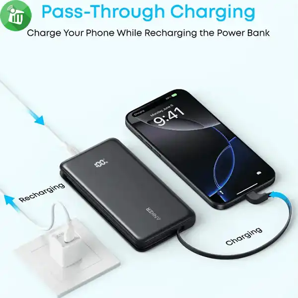 Keep your phone charging even while the power bank is plugged in. Pass-through technology allows charging both ways.