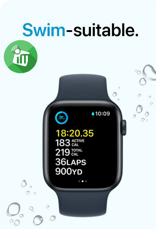 Apple Watch SE has a water resistance rating of 50 meters.2 Track your splits and sets in the pool. Map your route in open water. See accurate metrics even when using a kickboard. Whether you’re splashing, swimming, or surfing, the water’s fine.