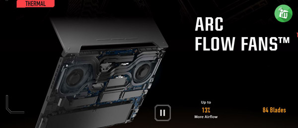 High core count CPUs create more heat when at full load. The TUF Gaming A15 is equipped to handle its high-power CPU with a pair of 84-blade Arc Flow Fans™. Our new variable thickness design has the dual benefit of increasing pressure while reducing turbulence, improving cooling performance without extra noise