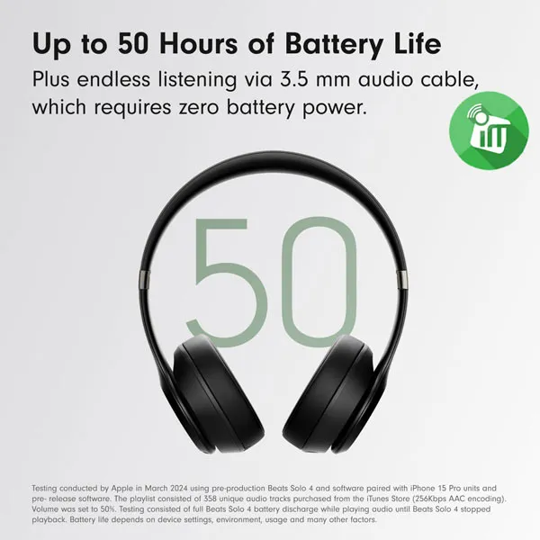 Beats Solo 4 Wireless Listening via the 3.5 mm audio cable doesn’t require any battery power at all — meaning you can enjoy truly endless playback without ever needing to charge.