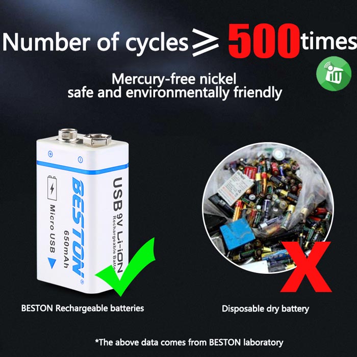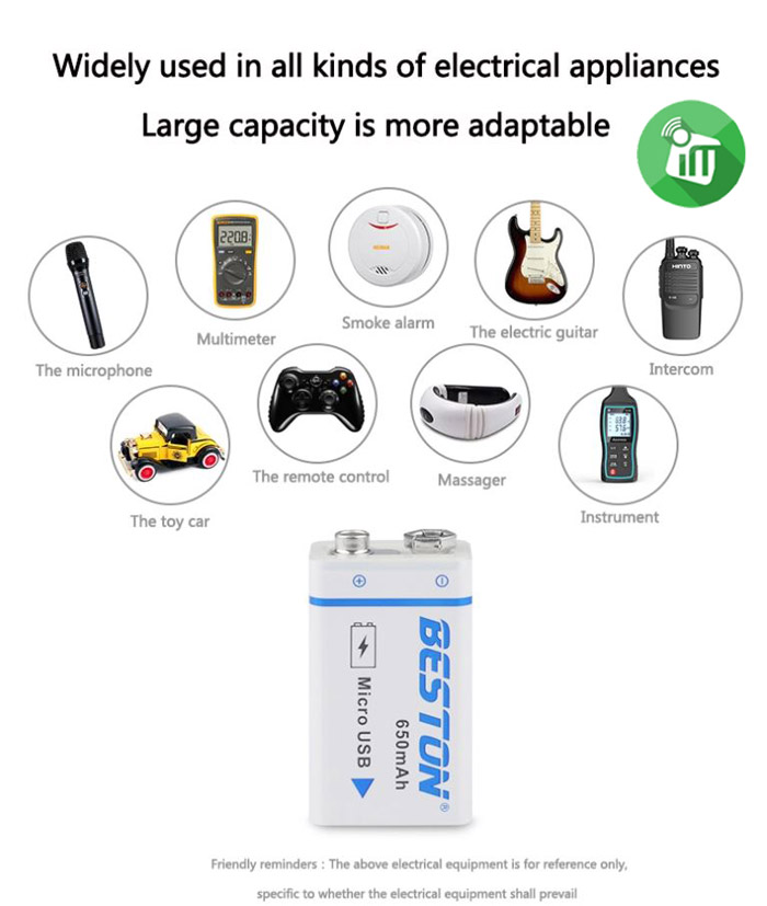 Beston 1PCS Size 9V Micro USB Rechargeable Battery 650mAh