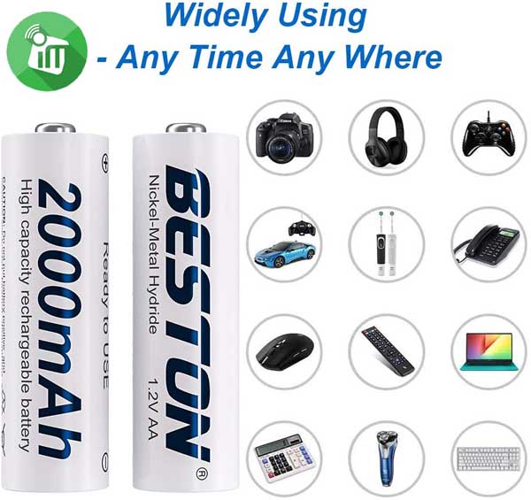 Beston AA 2000mAh 4PCS great for use in household devices. Similarly, use in household devices such as digital cameras, toys, remote controls, handheld games, 2-way radios, PDAs, flashlights, alarm clocks, LCD TVs, toothbrushes, shavers, and portable audio players