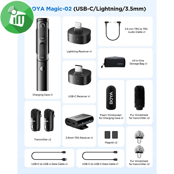 One system, most device! The wireless mic sets can seamlessly connect different types of interface devices without downloading any APP, plug and play, convenient and fast. BOYA Magic-02 offers USB-C, Lightning, and 3.5mm receivers for instant compatibility with USB-C Android smartphones (including iPhone 16/15 series), iPhone 11/12/13/14 series, cameras, camcorder, tablets, and computers.