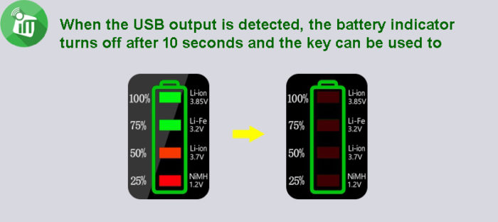 USB output indication: When the USB output is detected, the power indicator light turns off after 10 seconds, press the key to view the power.