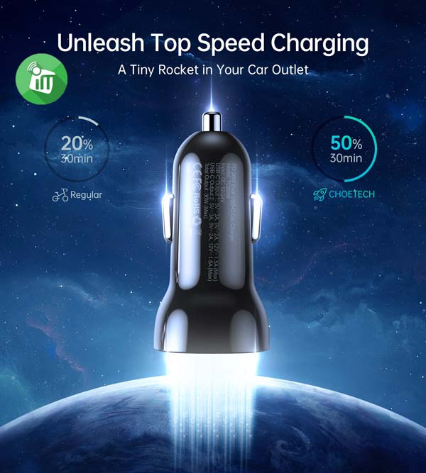 Advanced dual USB-C port PD 3.0 technology, the usb c car charger upports PD3.0/PD2.0/QC3.0/QC2.0/AFC/FCP and other protocols. The maximum output of this car charger adapter is up to 36W in total (18W output each port), each of the two PD ports can fast charge iPhone 12/11/X/XS/XR for 50% in 30 minutes, provide the full speed charging for two devices at the same time.