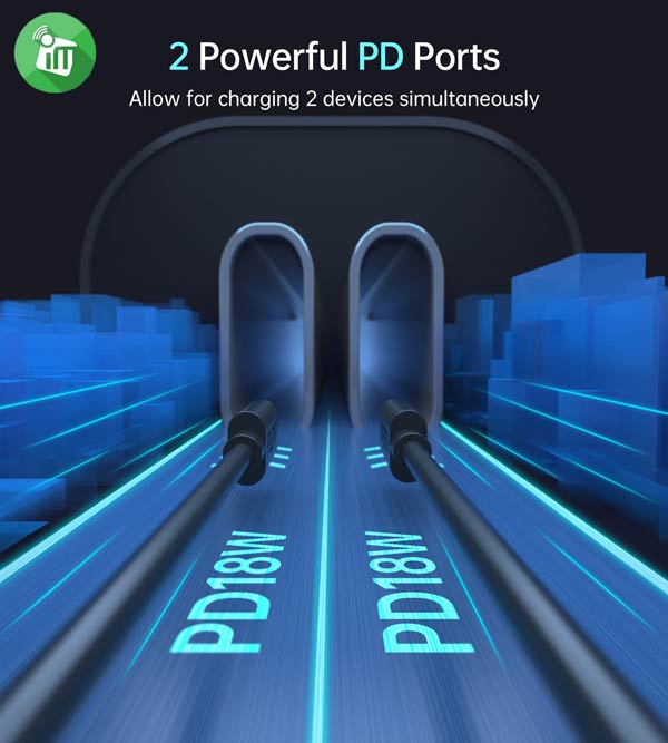 • Equipped with dual PD3.0 fast-charge ports so that the maximum output is up to 36W