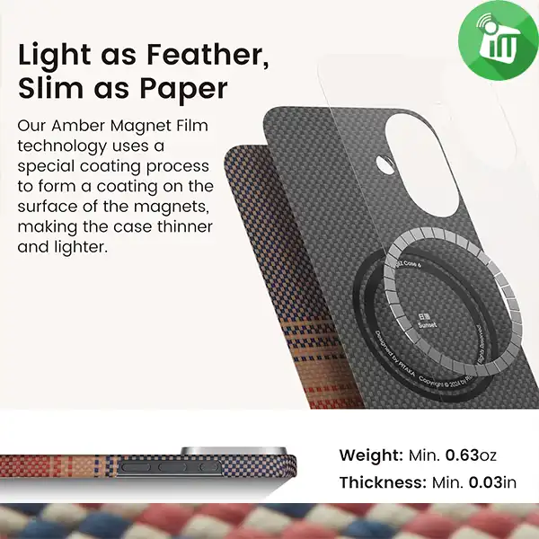 Woven from aramid fiber, a strong yet light material commonly utilized in aerospace and military gear, the iPhone 16 case provides exceptional strength, lightness, and resistance to scratch, corrosion, and discoloration. Unlike carbon fiber, it will not interfere with the signal and it is non-conductive, offering long-lasting protection for your phone.