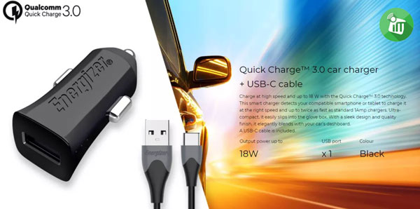 Quick Charge™ 3.0 car charger + USB-C cable : Charge at high speed and up to 18 W with the Quick Charge™ 3.0 technology. This smart charger detects your compatible smartphone or tablet to charge it at the right speed and up to twice as fast as standard 1Amp chargers.