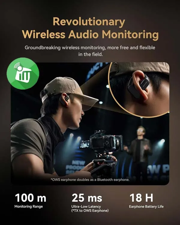 Transmit camera audio wirelessly to OWS earphones via the camera receiver, empowering you to move freely up to 100 meters (line-of-sight) without missing a beat. And the hot-shoe adapter streamlines setup, cutting cable clutter for a clean, professional rig.