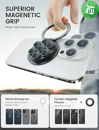 provides a secure and strong hold. For phones without MagSafe, simply attach the included metal ring to ensure a firm grip on all types of devices.