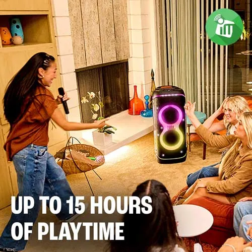 wirelessly link up multiple JBL Auracast™-enabled speakers for even more sound. And whether we’re streaming, singing karaoke, or plugging in mics and gear, the USB port and dual XLR inputs have us covered