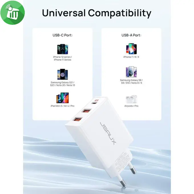With a 20W USB-C charging port and two USB-A charging ports, this 32W (total) 3-port charger supports multiple charging protocols and is able to support most mobile devices (except laptop), so you only need one charger to charge multiple devices at the same time.