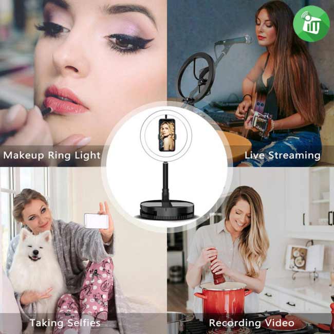 The beauty ring light designed with a longer cord and USB port can be powered by many devices,such as AC adapter,PC,power bank, USB charger,and etc.It is very easy to put together