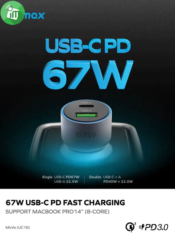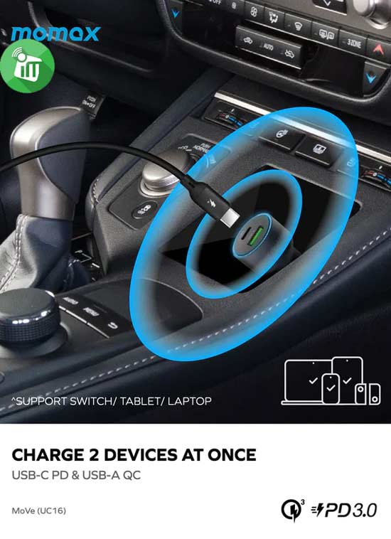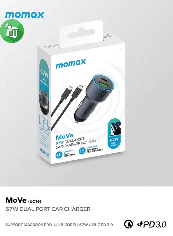 Momax UC16 MoVe 67W Dual Output Car Charger (With USB-C To USB-C 100W Cable)