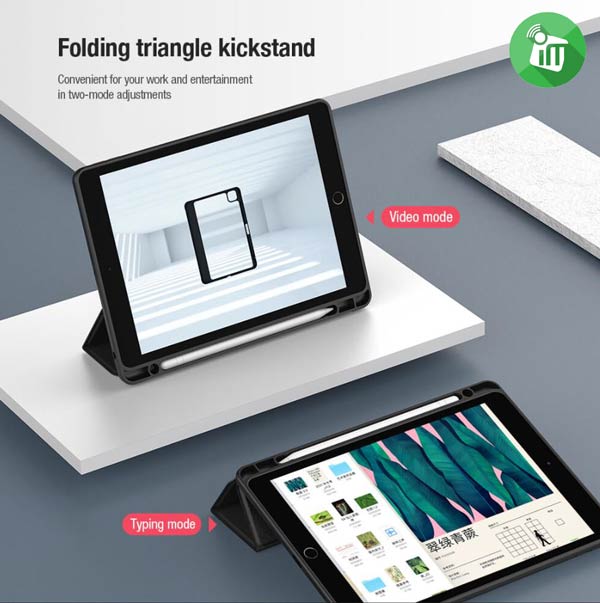 A crystal clear back panel protects while allowing a transparent view of the unique iPad design Folding-angle design to protect iPad’s lens, folding triangle bracket and pencil holder for full protection.