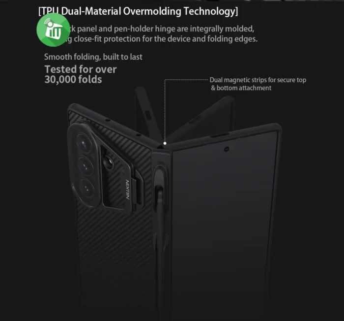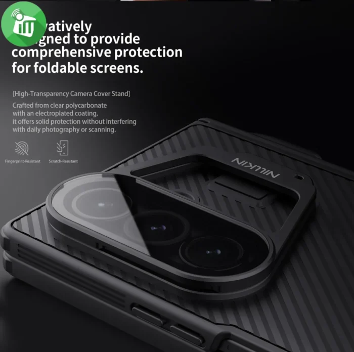 it offers enhanced shock resistance and scratch protection. The dual-shell hinge structure is reinforced with two of NILLKIN’s patented innovations — a sliding lens cover to guard your camera and privacy, and a rebound hinge for seamless folding and stability.