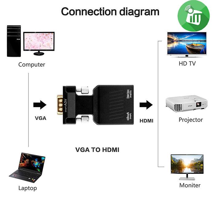 - HDMI Female to VGA adapter connects an HDMI compatible device to a monitor or projector with VGA port by extra HDMI cable