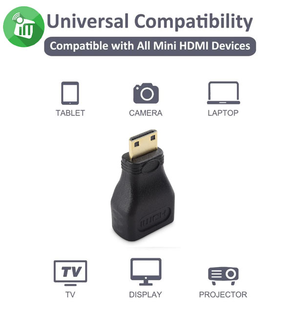 mini-HDMI male to HDMI female adapter converter easily converts the mini-HDMI port on your laptop, camcorder, camera or even some tablet to a standard HDMI Type A interface on a TV, monitor or projector