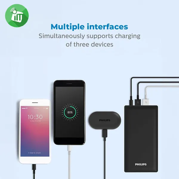 Philips DLP7721C 20000mAh Advanced protection against overheat, overvoltage, and overcurrent, ensuring safe and efficient charging for all your devices USB-C PD 20W fast charging port: Equipped with a port USB-C (Power Delivery) PD 20W For fast charging, allowing your mobile device to be charged from empty to 50% Within 30 minute.
