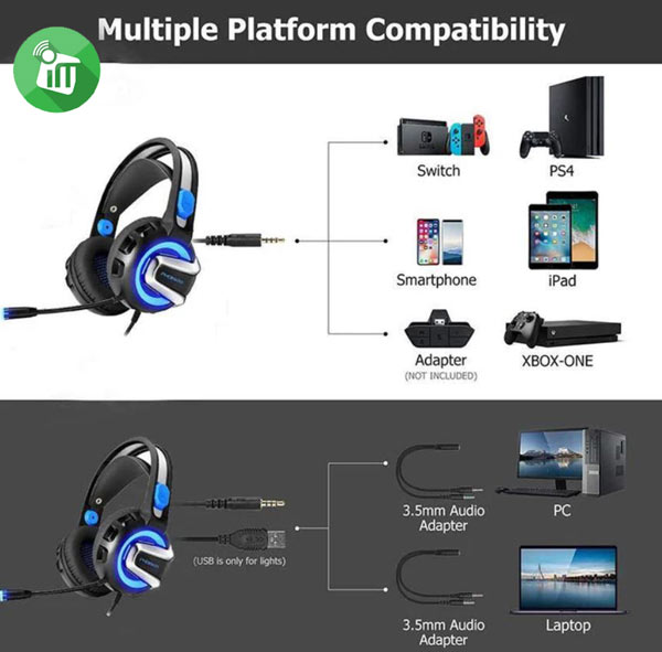 The gaming headset is compatible with almost any of your devices via its 3.5mm port(with a free Y splitter ). It’s suitable for PC, laptop, PS4, iPad, New Xbox One, Smartphone, DVD, iPhone, MP3, MP4, etc.(Please note that An extra Microsoft Adapter is required (Not Included) when connecting with an OLD VERSION Xbox One Controller.)