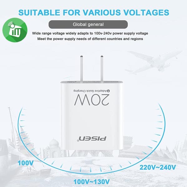 for instance, The compact and travel-friendly 20W USB-C power adapter ensures maximum portability and worldwide AC 100-240V compatibility make the USB socket adapter ideal for home, travel, office and international trips.