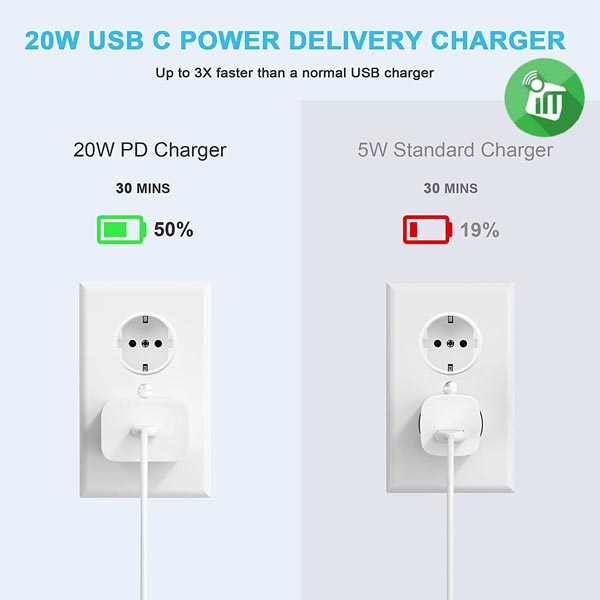 20W USB-C PD fast charger is designed for iPhone 12/12 mini/12 Pro/12 Pro Max/iPhone 8 and later, AirPods, iPad, Switch, Galaxy S8 and later. Compatible with any USB-C enabled device supporting 20w fast charging.