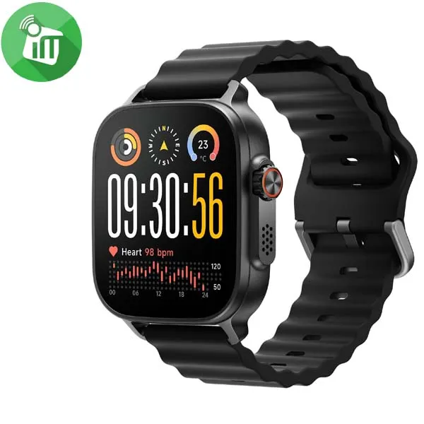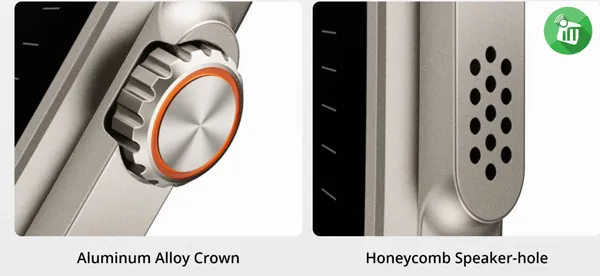 Aluminium alloy crown, hole for the speaker with honeycomb design. Waterproof strap with weft in vibrant colors, show your youth on the wrist. It closes securely when exercising, is easily cleaned with safe materials for the skin and ensures visibility in the dark.