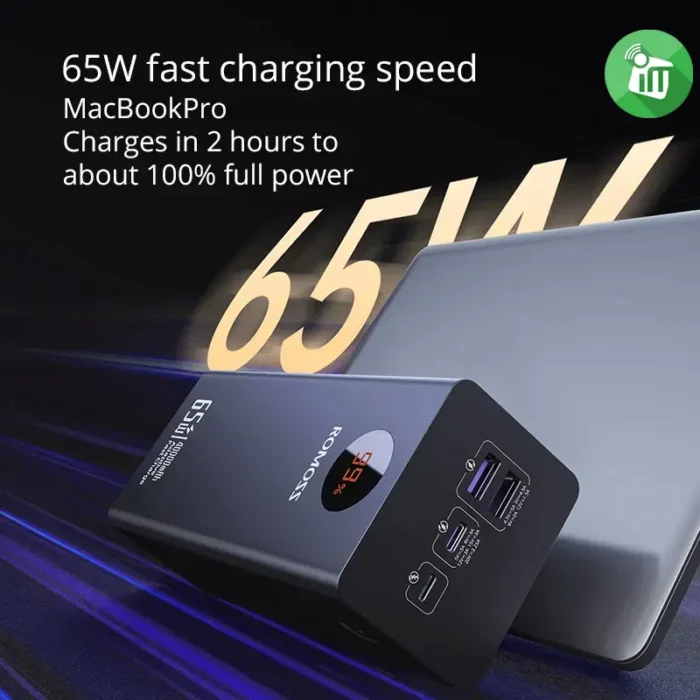 65W PD Fast Charge, allowing you to charge a 15-inch Mac Book Pro in just 1.8 hours. Also, it can be charged in 6 hours using a wall charger, providing you with energy for a long time.