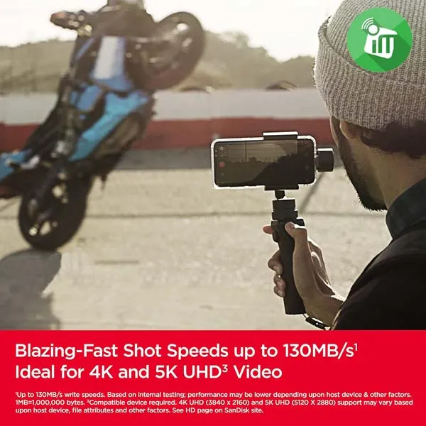 For Instance, Extreme write speeds up to 130MB/s enable you to capture fast-action photos in fine detail and film in 4K UHD video2 for real life quality playback. And with superfast read speeds of up to 190MB/s*, the SanDisk Extreme® microSD™ UHS-I Card won’t leave you waiting when you transfer those high resolution images and 4K UHD videos