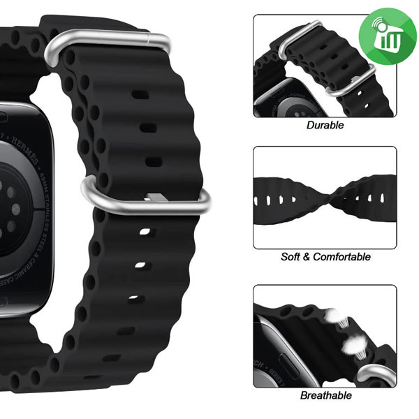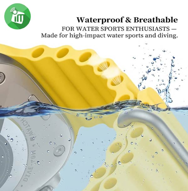 The sea is calling. Molded from rubber, itโs lightweight and flexible. It has a titanium buckle and a springโloaded titanium adjustable loop that secures through the tubes for a hyper-secure fit, even during high-speed water sports. t is adopts new innovative corrosion-resistant titanium buckle and adjustable loop, which can secure the apple band during high-speed water sports. It is made of high-quality makes the band more skin-friendly, and the wavy shape can better breathe and wick away sweat, allowing you to have a better wearing experience when surfing and diving etc. An attachable strap extension lets you wear it over a thick wet suit.