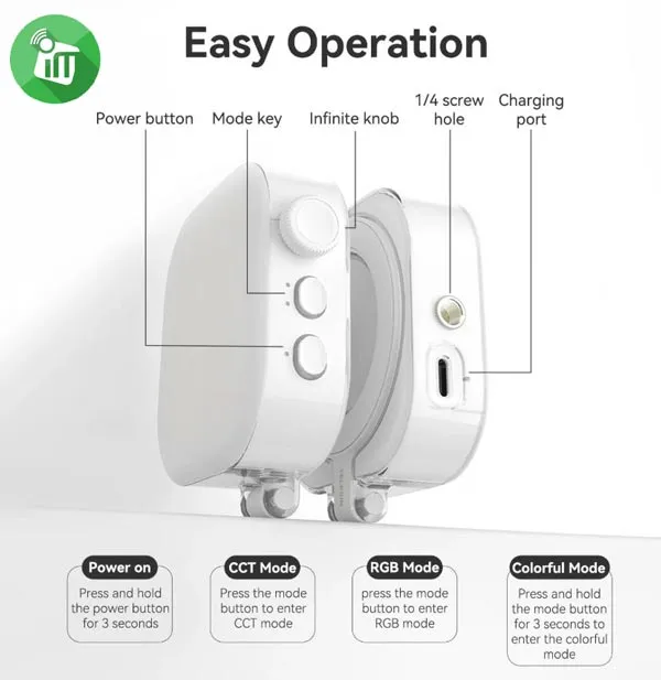 - This video light has an RGB atmosphere light mode, 0-360° adjustable, 360