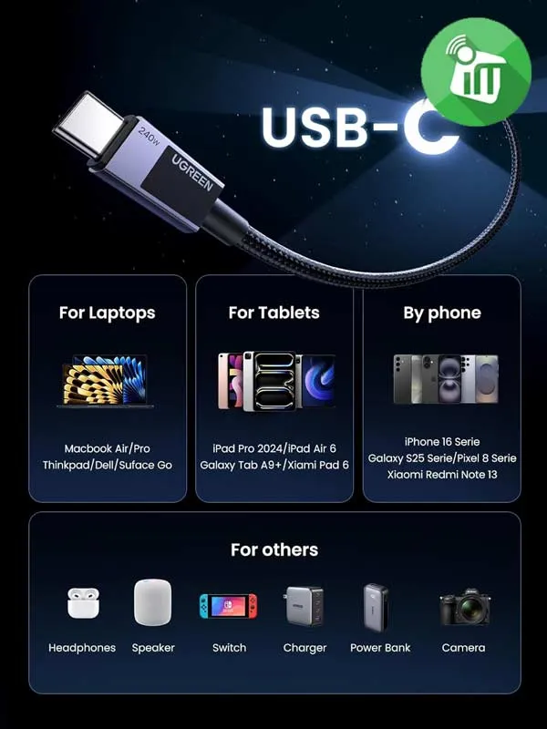 UGREEN L513 USB-C 2M Perfect for all USB-C devices, including MacBook Pro, iPad Pro, Dell XPS, Steam Deck, Galaxy S Series, and more. Whether for work or travel, it’s the one cable that powers them all