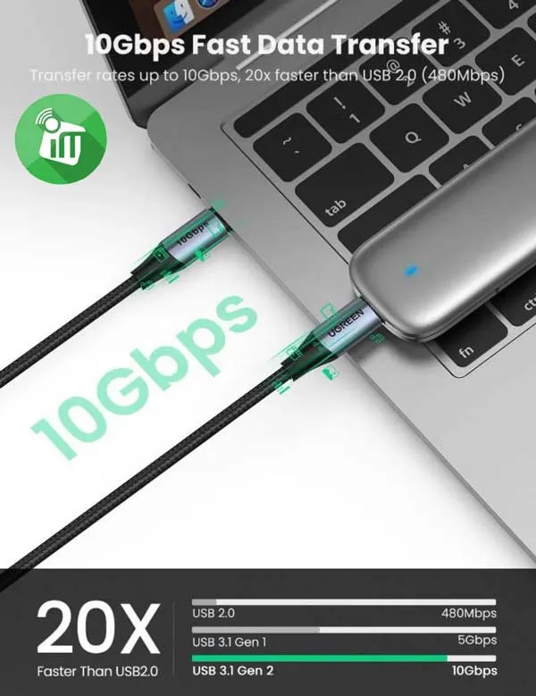 Are you frustrated by long waits for your files to be transferred? The Ugreen US355 cable, which transmits data at speeds of up to 10 Gbps , is the solution to your problems. Data transfer is up to 20 times faster than older USB standards. Transfer photos, videos and large files in a fraction of a second.