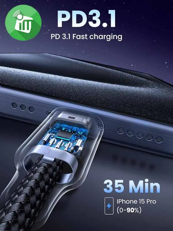 The built-in E-marker smart chip automatically adjusts voltage and current based on your device’s needs, protecting against over-current, overheating, and short circuits. Enjoy worry-free charging with stable and efficient power delivery every time.