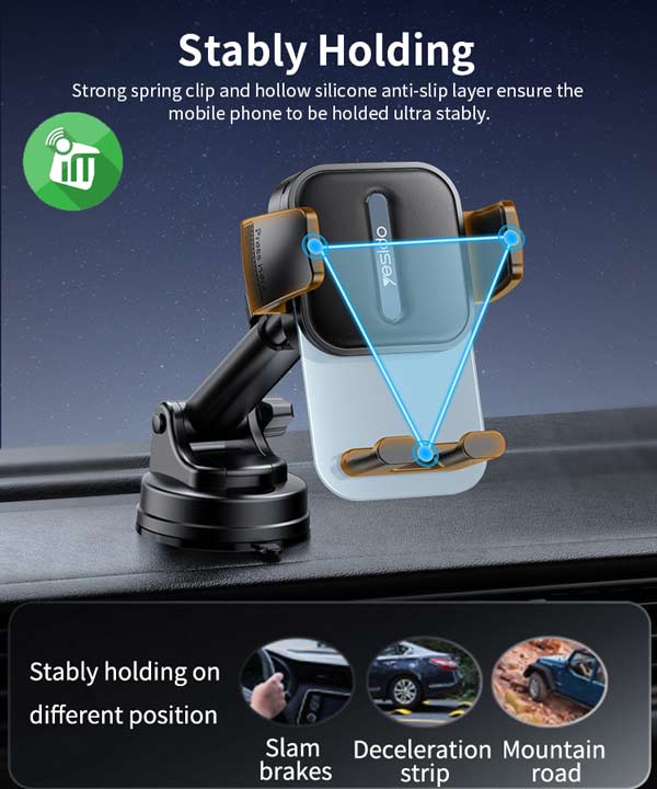 Engineered with a triangular support design, the Yesido C261 offers maximum grip and balance, securely locking your phone in place during your drive. This structure enhances resistance against shaking, making it ideal for both city streets and rough roads.