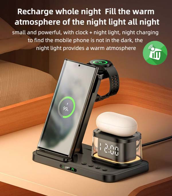 6. Equipped with a 15W fast wireless charging bracket, a digital clock, and a portable night light
