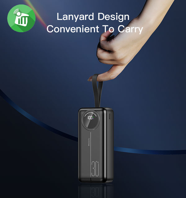 Designed for mobility, the power bank includes a built-in lanyard that makes it easy to carry by hand, attach to your bag, or hang for quick access. Its sturdy build is perfect for use during long-distance travel, commutes, or outdoor adventures.