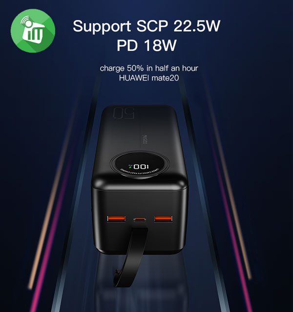 Supports SCP 22.5W (Huawei SuperCharge Protocol) and PD 18W (Power Delivery) fast charging technologies. Recharge your compatible devices to 50% in just 30 minutes, ensuring you spend less time plugged in and more time on the go.
